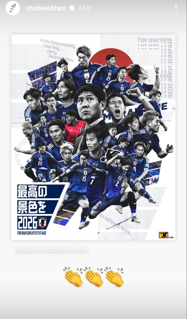 한편, 일본 축구 국가대표팀이 월드컵 본선에 진출하자 오타니 쇼헤이는 자신의 SNS에 일본축구국가대표팀 월드컵 본선 진출 사진과 함께 박수 이모티콘을 올리며 축하해줬다.