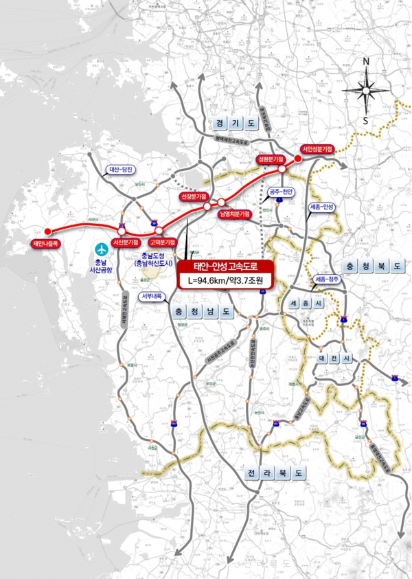 태안-안성 고속도로는 태안읍에서 서산·예산·당진·아산·천안 등 도내 5개 시군을 거쳐 경기도 안성까지 94.6㎞를 연결하는 사업으로 총 사업비는 3조 7000억 원에 달한다. 도는 이 고속도로가 건설되면 도내에서 유일하게 고속도로가 없는 태안지역에 광역교통망을 연결, 접근성을 획기적으로 개선할 것으로 기대하고 있다. 또 2개 도, 7개 시군, 서해안과 서산-영덕, 서부내륙, 당진-천안, 경부, 평택-제천 등 6개 고속도로를 연결함으로써 충남 서해안과 내륙, 수도권 간 교통이 크게 향상될 것으로 내다보고 있다.