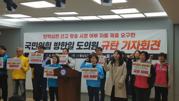 이들은 “헌법재판소의 탄핵 심판 방송이 생중계되던 그날, 충남의 많은 교사들은 학생들과 함께 헌법기관의 역할을 배우고, 시민으로서 국가를 바라보는 시각을 키우기 위해 탄핵 심판 선고 방송을 시청했다”며 “하지만 방 의원은 되려 탄핵 심판 선고 방송시청 관련 자료 제출 요청 공문을 지난 8일 보내 교사들을 압박하고 있다”고 지적했다.