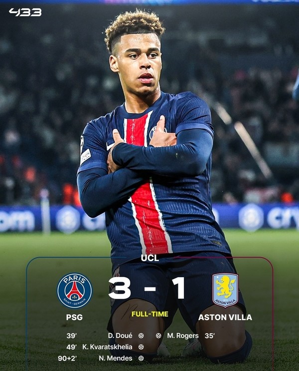 이후 후반 추가시간에 스류패스를 받은 멘데스가 슈팅 페인트 동작을 취하며 빌라의 수비진을 재낀 후 침착하게 공을 밀어넣으며 PSG가 기분좋은 3대1 승리를 거뒀다.