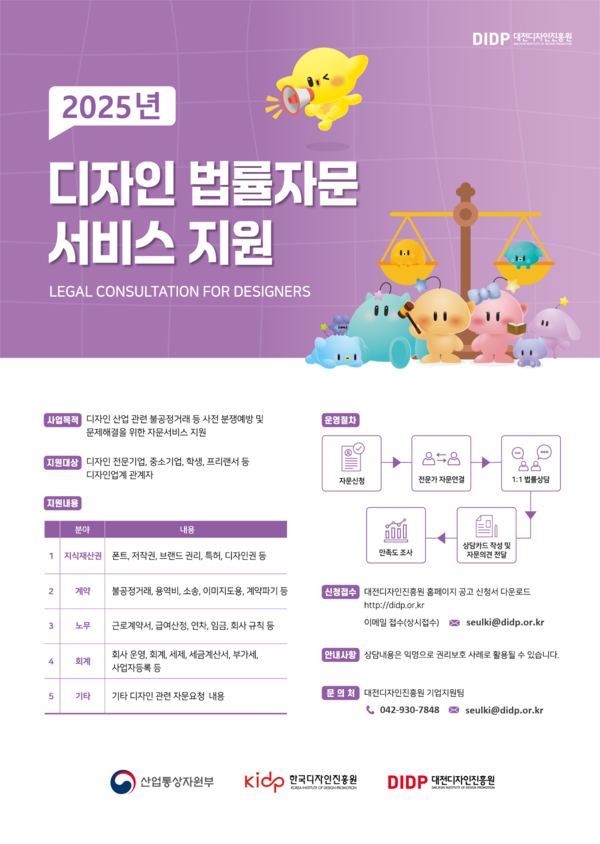 지원사업은 법률적 지식 부족으로 인해 어려움을 겪고 있는 디자인 전문기업, 중소기업, 학생, 프리랜서 등 디자인 업계 종사자를 대상으로 한다.변호사, 변리사, 노무사, 회계사 등 분야별 전문가로 구성된 디자인법률자문단이 일대일 무료 상담 및 자문 서비스를 제공, 분쟁 요소를 사전에 예방하고 피해를 최소화할 수 있도록 지원한다.