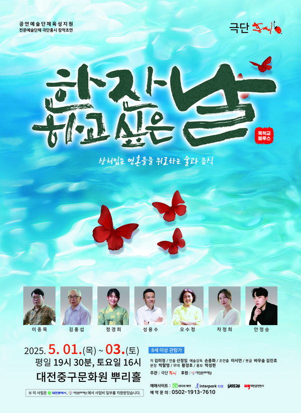 공연은 작가 김미정과 연출 신정임이 함께하고, 지역에서 활발히 활동하는 배우 이종목, 김홍섭, 정경희, 성용수, 오수정, 차정희, 안정승이 무대에 오른다. 공연은 평일 19시 30분, 토요일 16시에 진행되며 예매는 네이버, 인터파크, 예스24, 대전공연전시에서 가능하다. 자세한 사항은 0502-1913-7610으로 문의하면 된다.