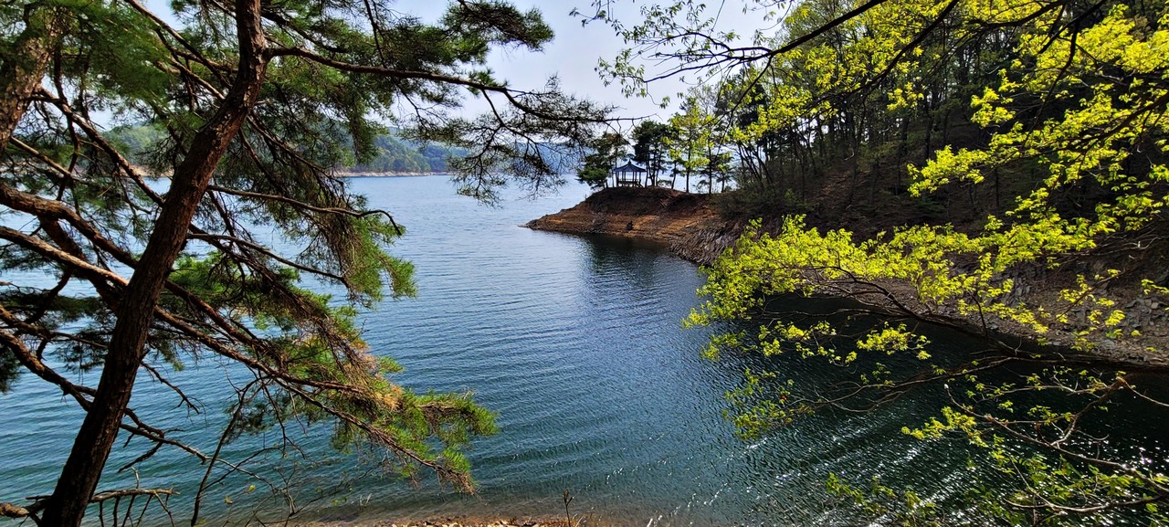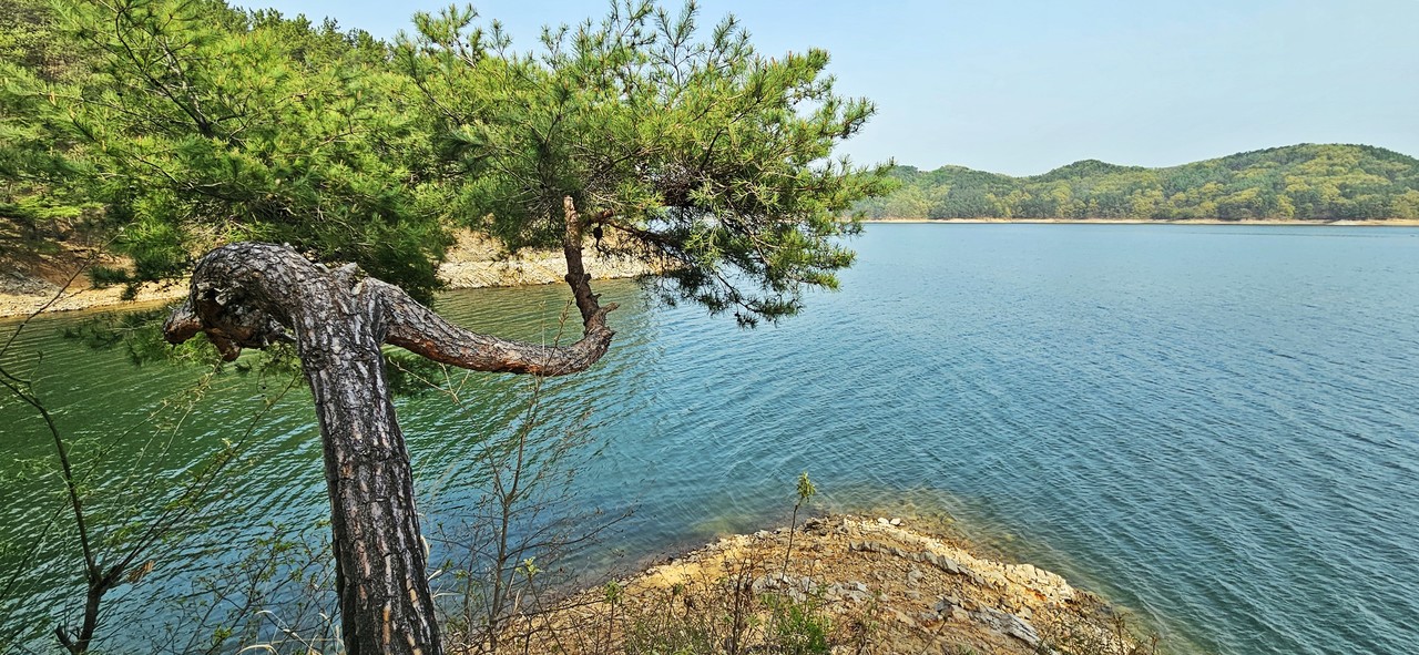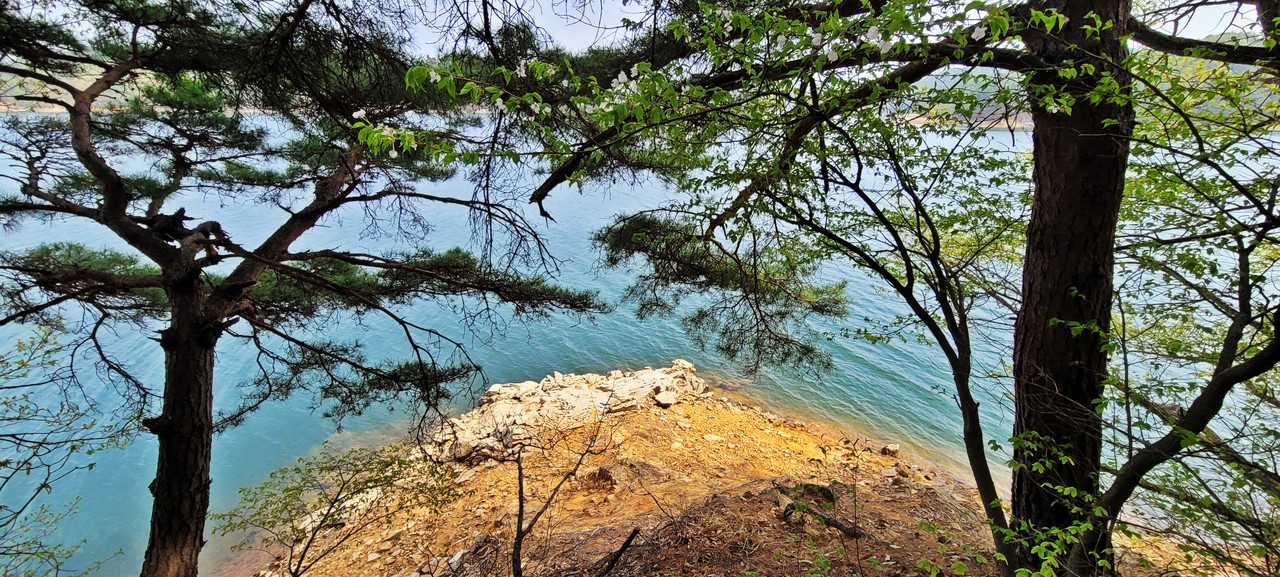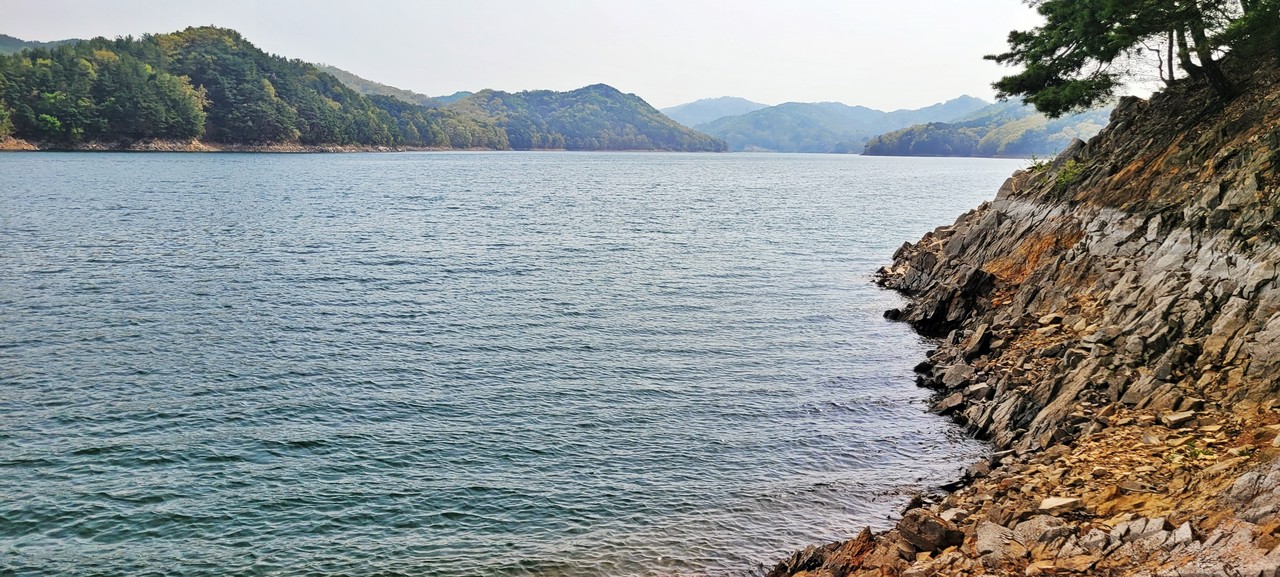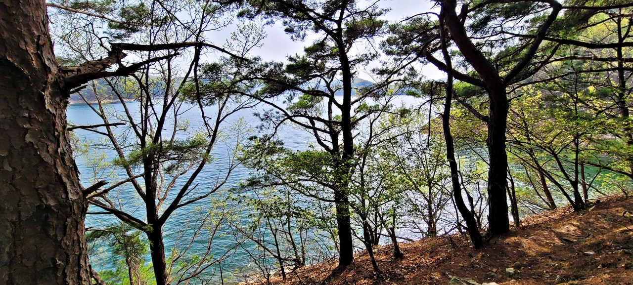 짧은 휴식을 끝내고 곧 만나는 갈림길 이정표. 오른쪽은 대청정/보조여수로 쪽으로 바로 내려가는 자작나무길이고 왼쪽은 우회길이다. 우회길 왼쪽을 택했다. 방향이 바뀌자마자 급한 내리막이다. 조심조심 한 걸음씩 내디딘다. 몇 분 후, 땅끝이 보인다. 호수와 땅의 경계에 선다. 바닷가 같은 바람, 일렁이는 물결, 내 마음도 동한다. 짙푸른 물빛과 가파른 절벽이 어느 섬에 온 듯한 착각에 빠지게 한다. 물과 뭍의 경계. 여기선 누구나 신선이 된다.