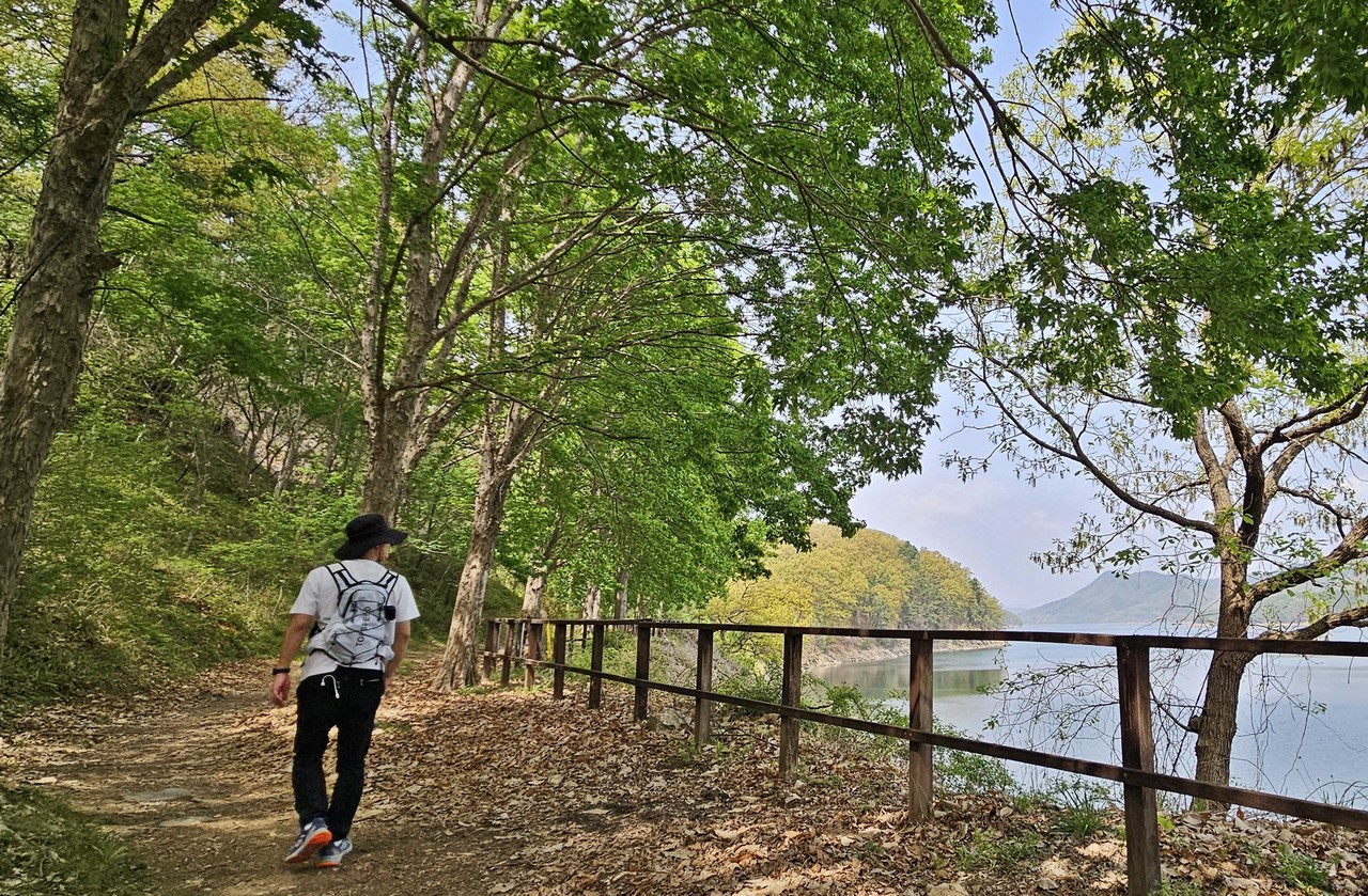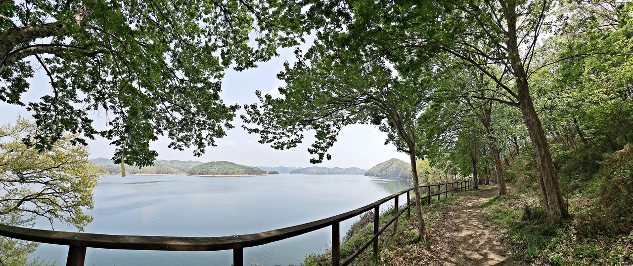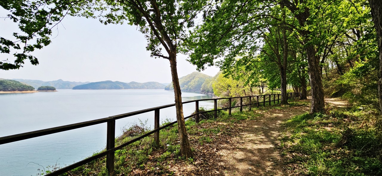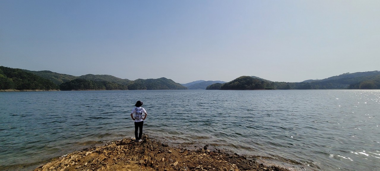 짧은 휴식을 끝내고 곧 만나는 갈림길 이정표. 오른쪽은 대청정/보조여수로 쪽으로 바로 내려가는 자작나무길이고 왼쪽은 우회길이다. 우회길 왼쪽을 택했다. 방향이 바뀌자마자 급한 내리막이다. 조심조심 한 걸음씩 내디딘다. 몇 분 후, 땅끝이 보인다. 호수와 땅의 경계에 선다. 바닷가 같은 바람, 일렁이는 물결, 내 마음도 동한다. 짙푸른 물빛과 가파른 절벽이 어느 섬에 온 듯한 착각에 빠지게 한다. 물과 뭍의 경계. 여기선 누구나 신선이 된다.