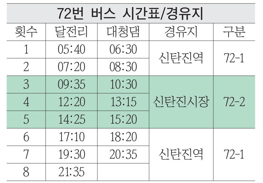 72-1은 달전리 출발 기준 05:40 07:20 17:10 19:30 21:35이다. 72-2는 09:35 12:20 14:25 3대다. 달전리에서 신탄진까지 25분(72-2 기준) 정도 걸린다. 72번 타고 신탄진에서 대청댐 방향으로 갈 때 헷갈리지 않는 가장 쉬운 방법은 무조건 신탄진동행정복지센터 정류장에서 타는 거다. 72-1, 72-2 둘 다 이곳을 지난다.