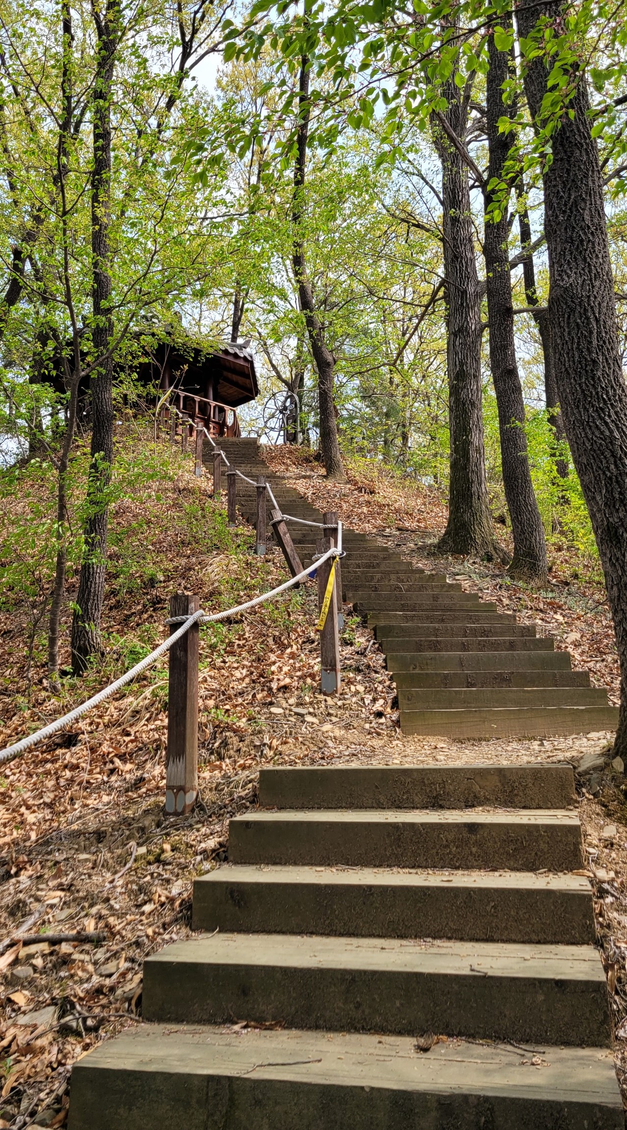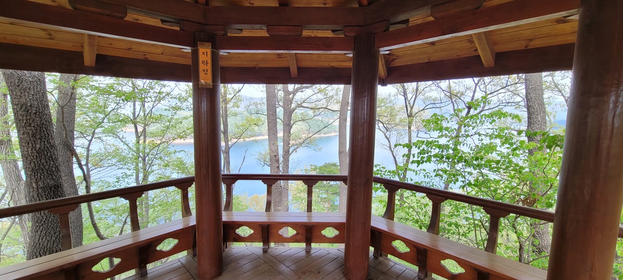 15분쯤 걸었나, 가파른 나무계단이 나온다. 다행히 길진 않다. 지명산에서 첫번째로 만나는 정자, 지락정 오르는 계단이다. 지락정에 올라 물 한 모금 마시며 휴식. 대청호 건너편 땅 청남대 방향을 바라본다. 초가정 근처의 광장과 임시정부기념관이 눈에 들어온다.