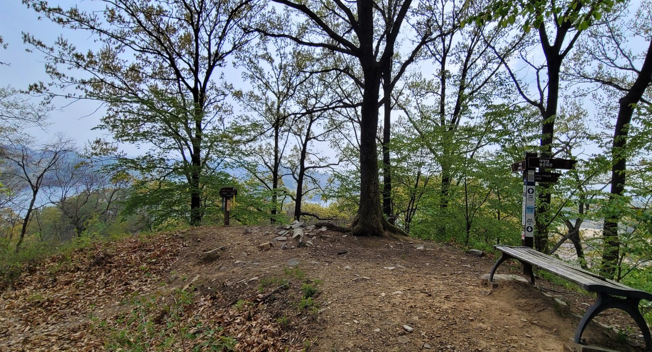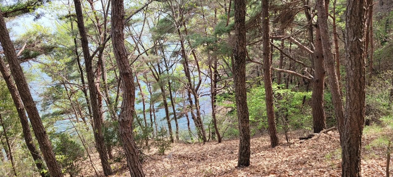 비밀의 숲을 나와서 풋살장 앞을 지난다. 오른쪽으로 내려가면 (지금은 운영하지 않는)로하스캠핑장/보조여수로 댐으로 바로 가는 길이고 직진해서 산길을 오르면 지명산 오르는 길이다. 직진한다. 고도가 살짝 높아지자 왼쪽 아래 대청호 물빛의 파랑이 짙어진다. 나뭇가지 사이 뷰도 아량을 베푼다. 건너편 청남대 끝부분을 보여준다.