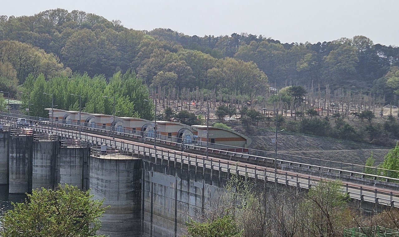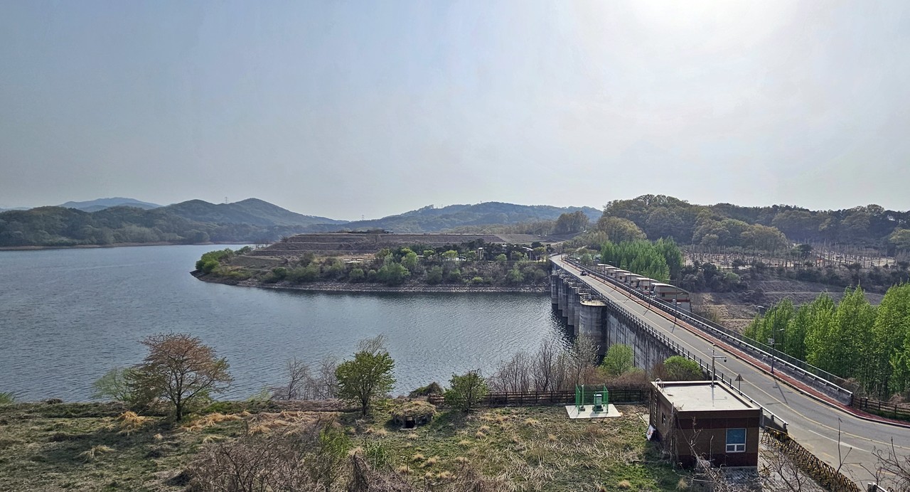 지명산 반도길을 돌아 나간다. 보조여수로 앞 정자 미호정이 마중나와 있고 그 아래 보조여수로댐이 자리하고 있다. 안내판 설명에 따르면 보조여수로댐의 목적은 ‘기상이변에 대비한 방류능력 증대로 대청댐 안정성 확보’다. 홍수가 날 정도로 위험할 때 추가방류를 위한 보조댐이라 하니 이 댐은 사용되지 않길 바라며 미호정을 돌아 내려간다. 보조여수로 댐 위를 걸어 이촌마을로 향한다. 댐 건너 오른쪽에 공사가 한창이다.