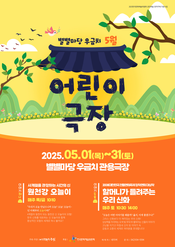 마당극패 우금치가 어린이극장에서 선보이는 ‘할머니가 들려주는 우리 신화’는 2008 대한민국전통연희축제 창작연희 대상작으로, 사계절을 관장하는 시간의 신 ‘오늘이’의 모험을 그린 ‘원천강 오늘이’와 집과 마을을 지키는 수호신 ‘성주신’과 ‘터주신’의 이야기 ‘황우양씨와 막막부인’ 두편을 엮은 구성으로 우리 고유 신화를 어린이의 눈높이에 맞춰 재해석한 창작 마당극이다.