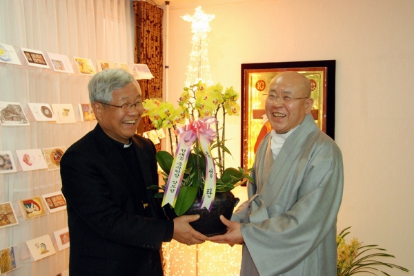 대한불교천태종 총무원장인 장도정 스님(대전 광수사 주지)이 지난 18일 천주교 대전교구청을 방문, 유흥식 교구장(라자로 주교)에게 예수 탄생을 경축하는 메시지와 함께 직접 키운 난을 선물하고, 환담을 나눴다.