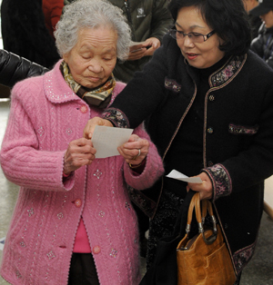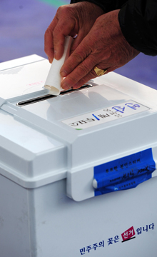 한 유권자가 두손을 모아 소중한 한표를 행사하고 있다. 대전 동구 산성동 제 8투표소에 마련된 투표소에서 한 노인이 가족의 안내를 들으며 기표소로 향하고 있다.