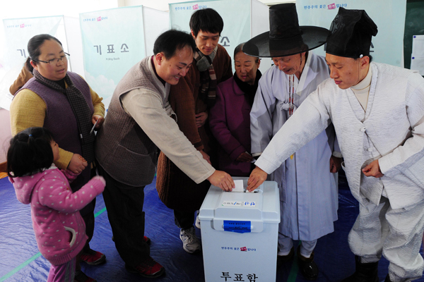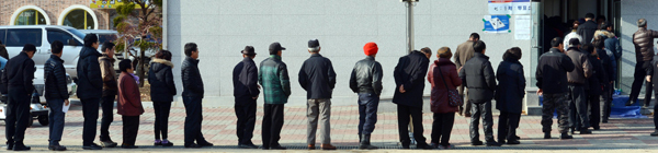 제 18대 대통령 선거일인 19일 충남 논산시 연산초에 마련된 투표소에 유권자들이 투표를 하기 위해 길게 줄지어 서 있다. 양지서당 유복엽 큰 훈장과 가족들이 소중한 한표를 행사하고 있다. 강추위에도 불구하고 한 어르신이 투표를 하고 있다.