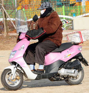 한 유권자가 오토바이를 타고 투표장으로 향하고 있다.
