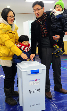아이들과 함께 나온 한 가족이 소중한 한표를 행사하고 있다.