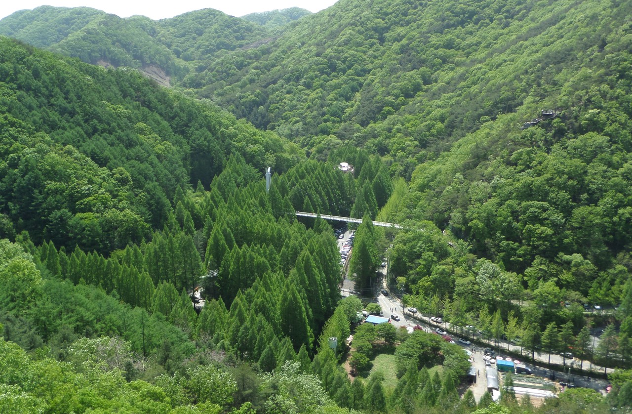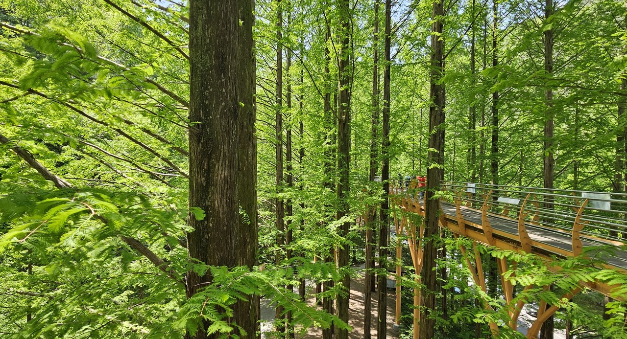 바로 아래 출렁다리로 향한다. 140m로 짧지만 메타세쿼이아와 눈 맞추며 걷는 매력, 아래를 내려다보는 재미가 쏠쏠하다. 장태산휴양림 명물로 소문 자자한 숲속 어드벤처(스카이웨이, 스카이타워) 걷는 재미를 더한다. 공중을 걷는 기분, 스카이웨이의 시작이다. 15m 높이의 스카이웨이로 진입하면 공간이동을 한 듯한 착각이 든다. 초록세상 속으로 들어가는 ‘하늘길’이다. 길이 196m 하늘길 끝엔 27m 높이 전망대 스카이타워가 기다린다. 빙글빙글 네 바퀴를 돌아 오르면 스카이타워의 깨끗한 바람이 마중 나온다.