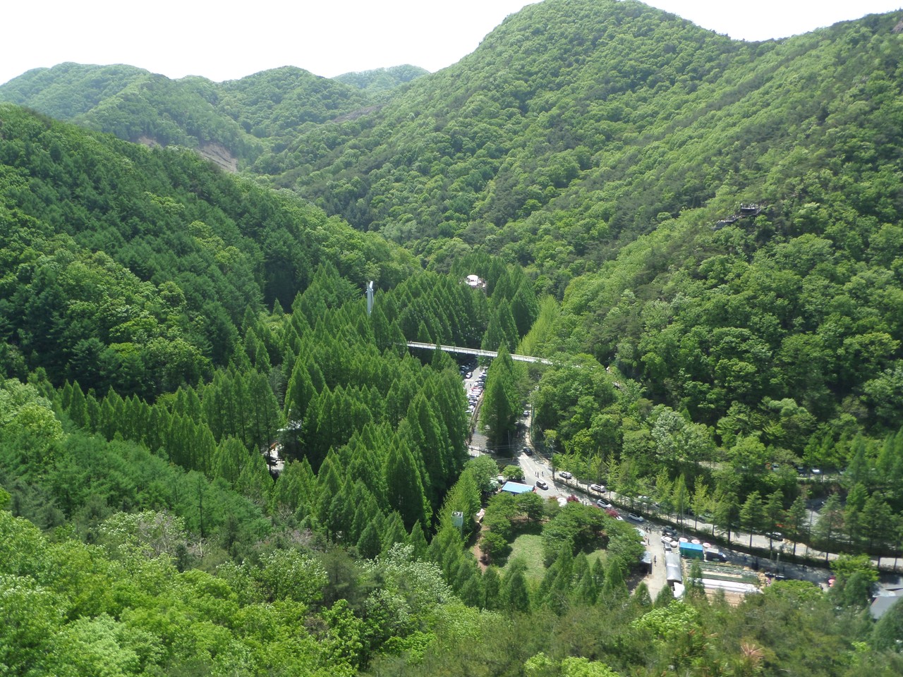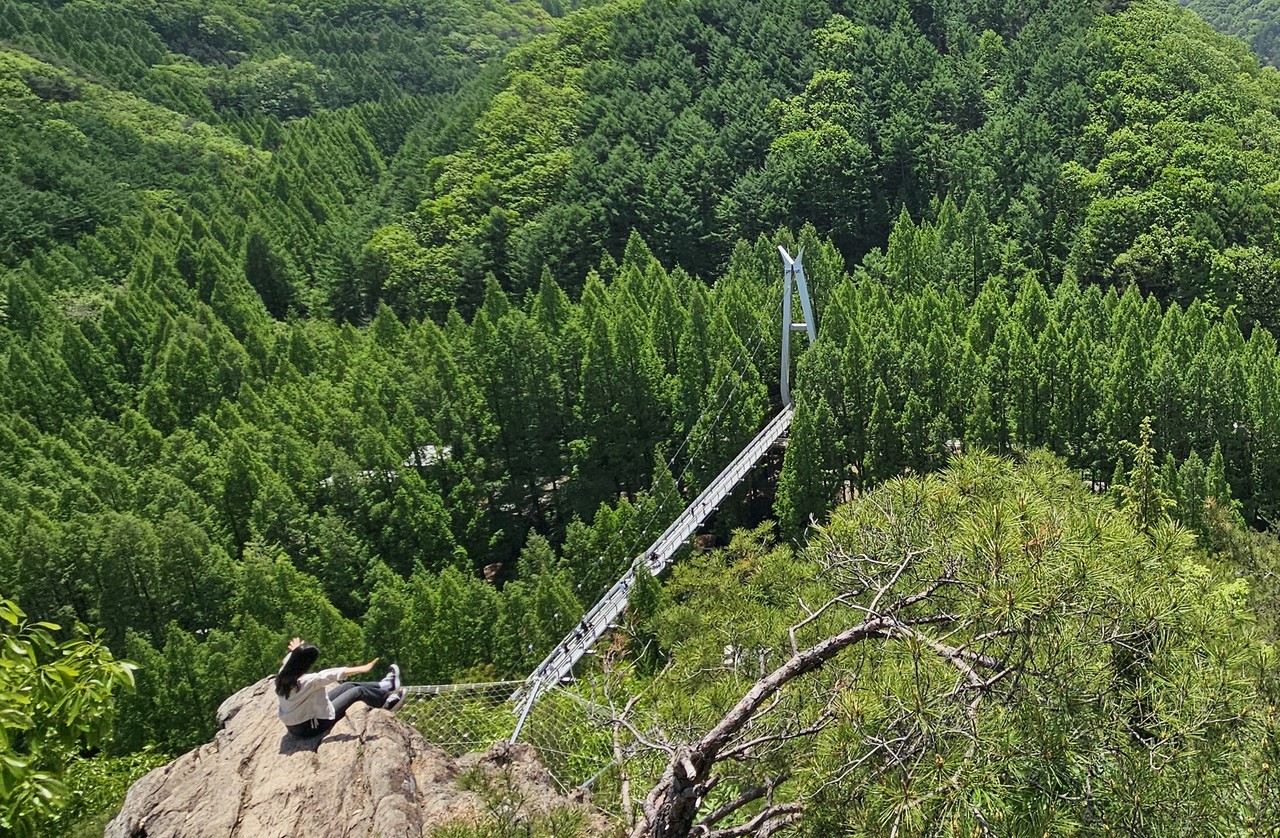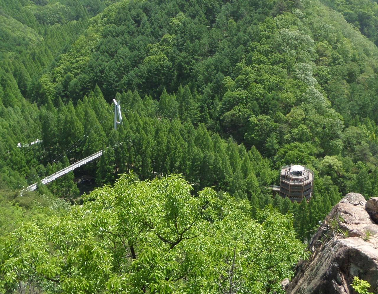 장태산둘레산길 안내도 앞에서 출발한다. 왼쪽 공중엔 출렁다리가 있다. 둘레산길 방향으로 길을 잡고 나무계단을 오른다. 오르다 보면 갈래길이 나오는데 왼쪽으로 가면 출렁다리고 오른쪽은 둘레산길 코스다. 둘레산길 코스 방향으로 넉넉잡아 10분쯤 오르면 확 트인 조망쉼터가 맞이한다. 휴양림 전체가 눈에 들어온다. 메타세쿼이아 사이로 놓인 출렁다리와 스카이타워가 발 아래에 있다. 왼쪽으로 시선을 두면 전망대 장태루 앞의 통신철탑과 형제바위 전망대도 보인다. 초록 숲은 감탄사를 부른다. 늦가을 뺨 치는 오월의 풍광이다. ‘이국적’이란 표현이 마침맞다. 출렁다리와 숲속어드벤처를 오가는, 행복한 표정의 사람들 모습도 흥미롭다. 행복해 보여 좋다.