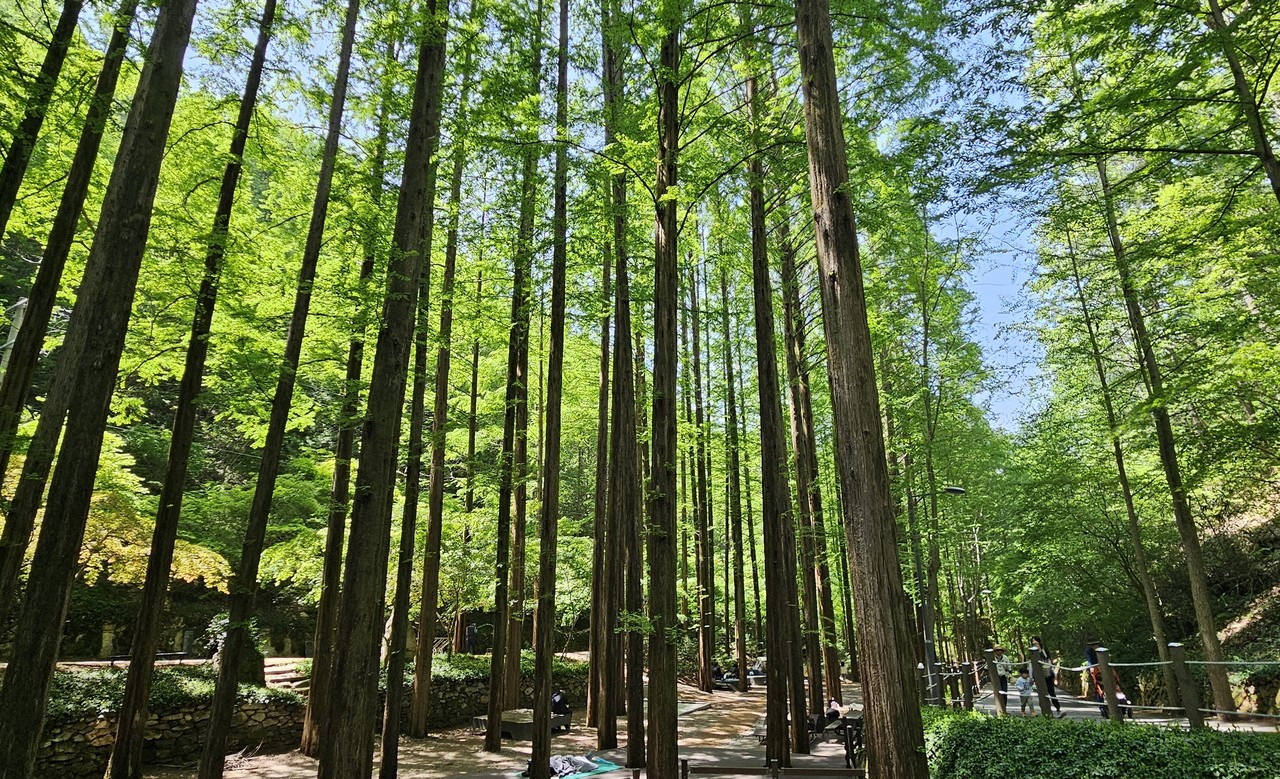 메타세쿼이아 그늘 산림욕장에서