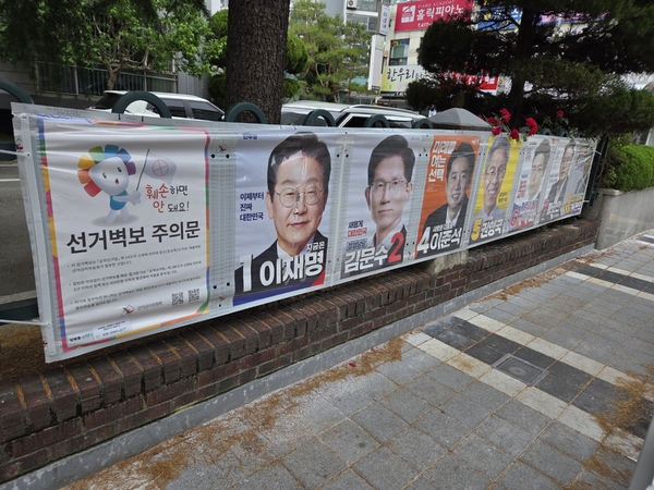 25일 대전 서구의 한 도로변에 게시된 제21대 대통령선거 후보자 선거벽보 가운데 더불어민주당 이재명 후보의 벽보 일부가 찢겨 훼손된 채 걸려 있다.