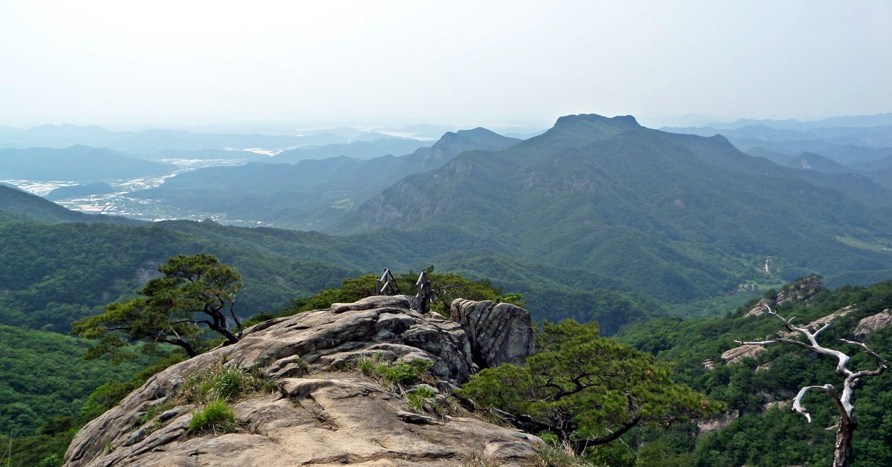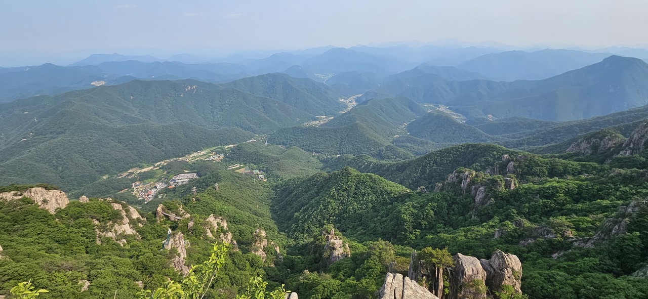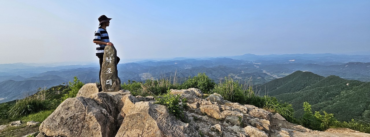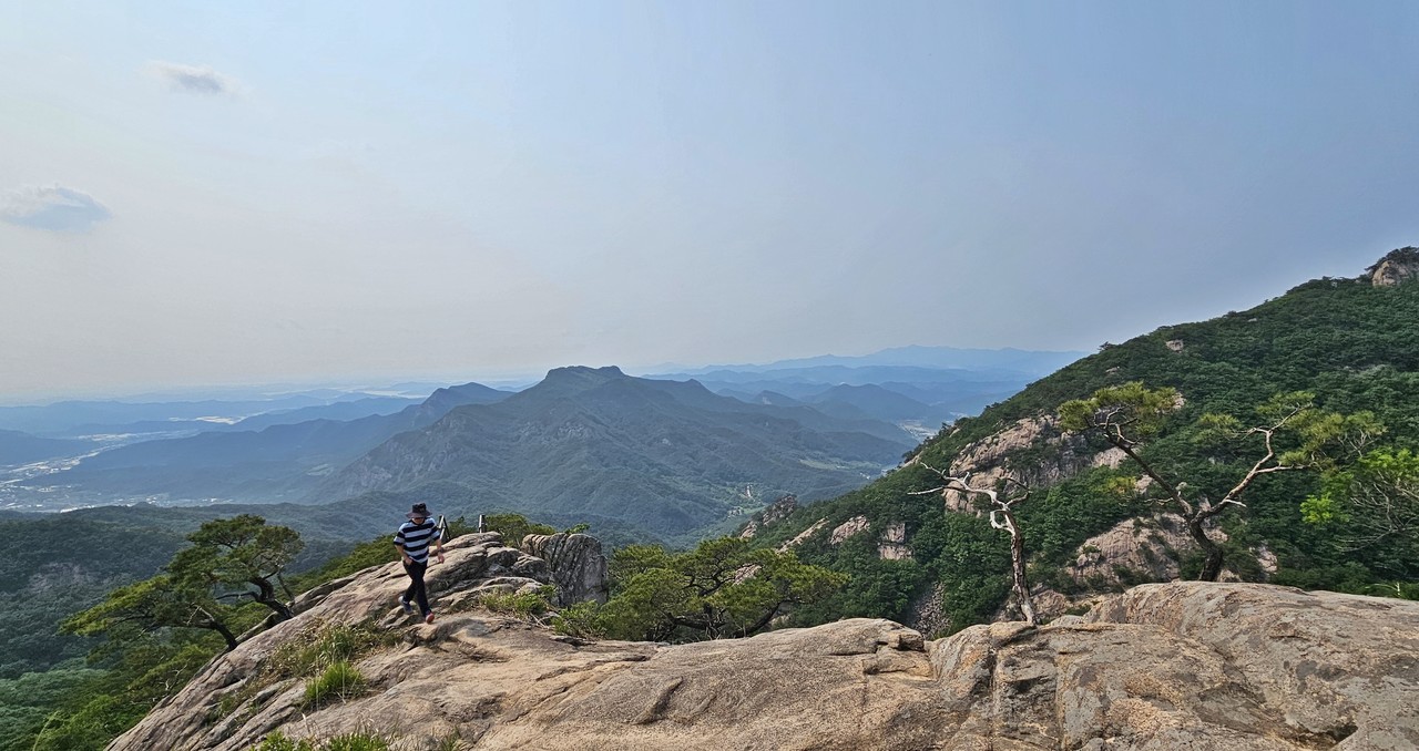 마천대까지 2㎞. 출발점으로 돌아갈까 하다가 위쪽으로 길을 밟는다. 느리게 느리게 올라간다. 금세 이정표가 또 나온다. ←2.1㎞ 수락주차장, 마천대 →1.2㎞. 30여 분 뒤 긴 계단을 오른다. 마지막 계단을 탁 밟는다. 조망이 열린 바위 쉼터가 하이파이브 한다. 광활한 풍경이 안아준다. 휴~.