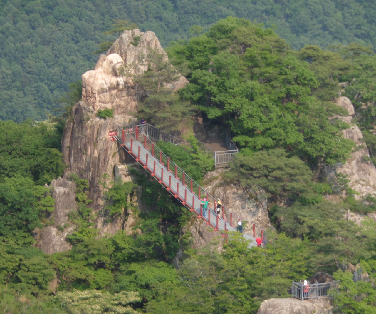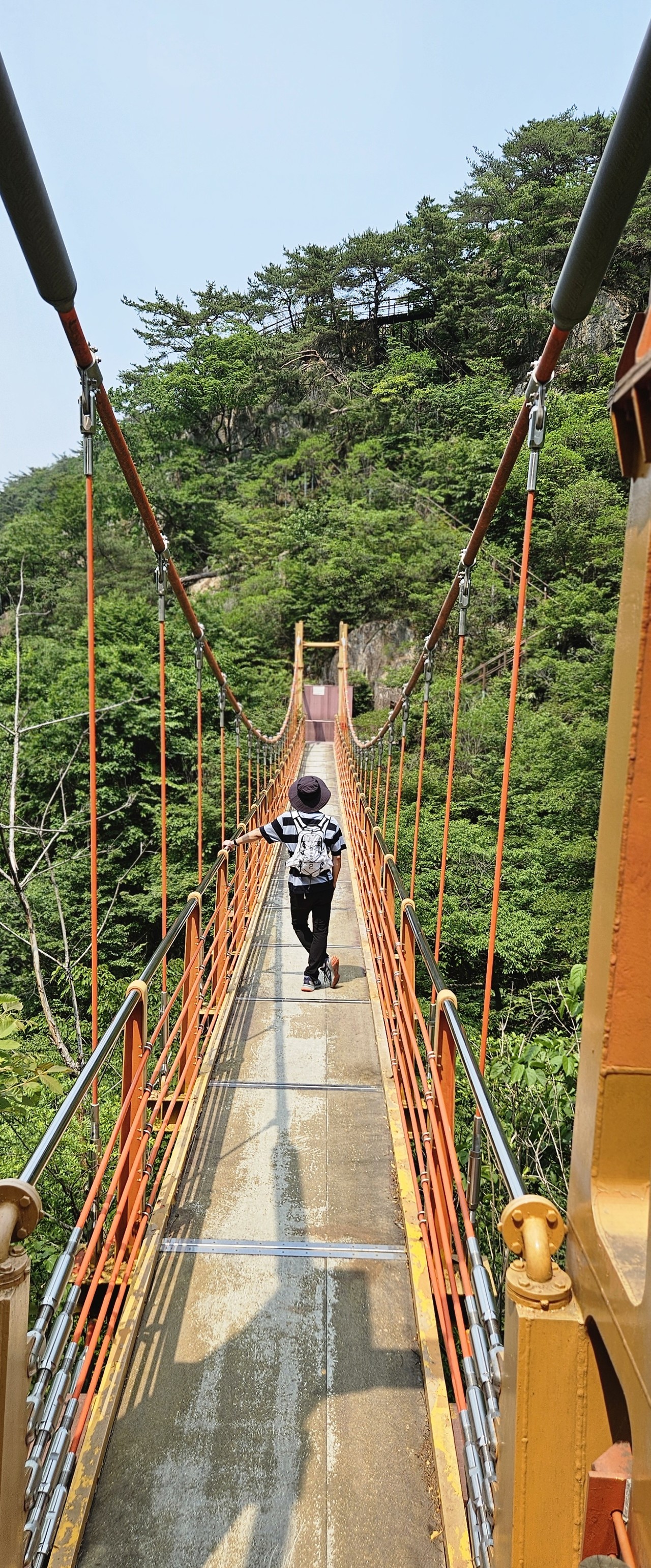 헉헉대며 올라가다 보니 저 아래 군지구름다리가 보인다. 구름다리 규모는 작다. 그래도 구름다리는 늘 신난다. 걷다보니 혼자여도 출렁인다. 구름다리 중간에 멈춰서 바람을 맞으며 다리 앞 풍경에 젖는다.