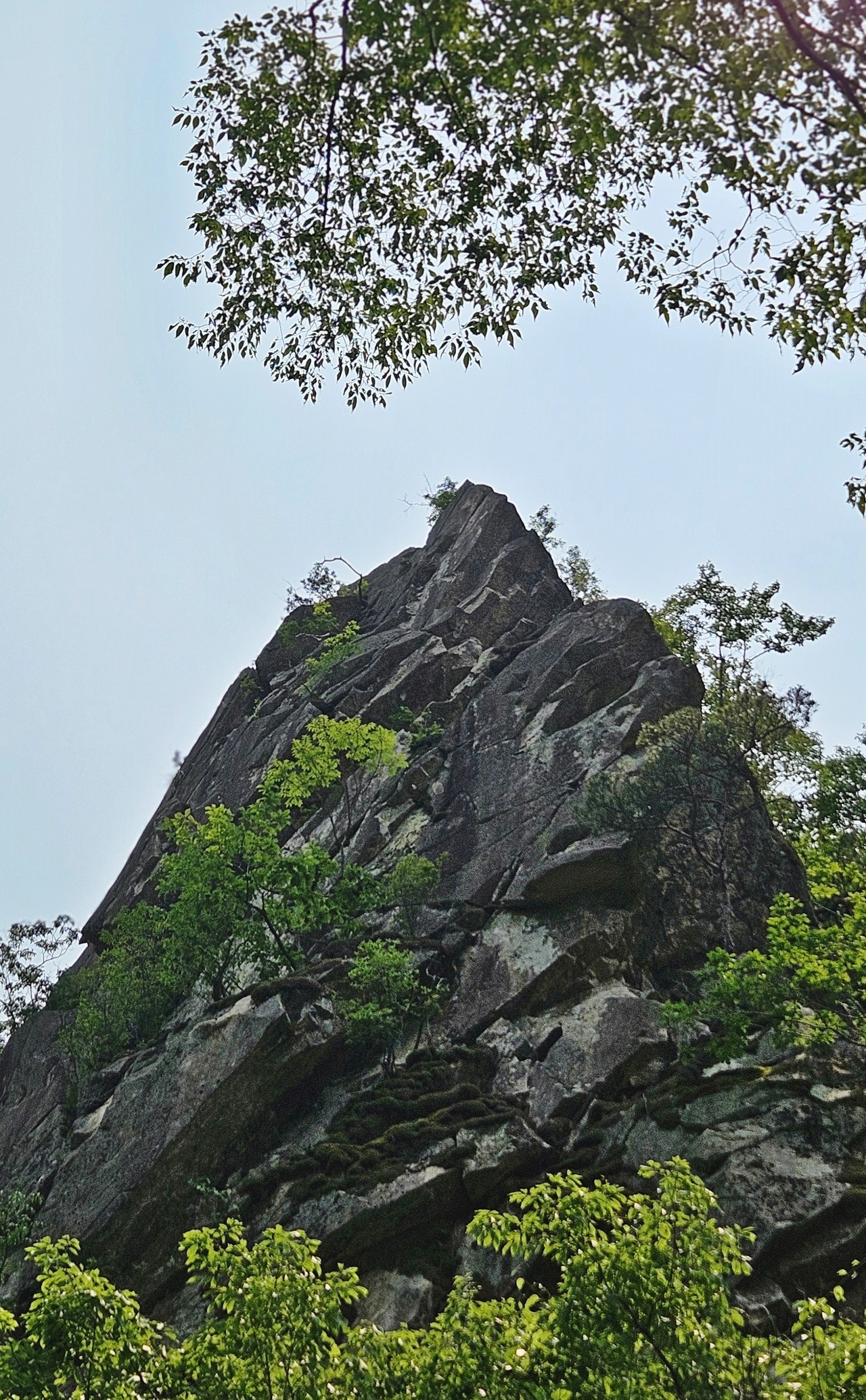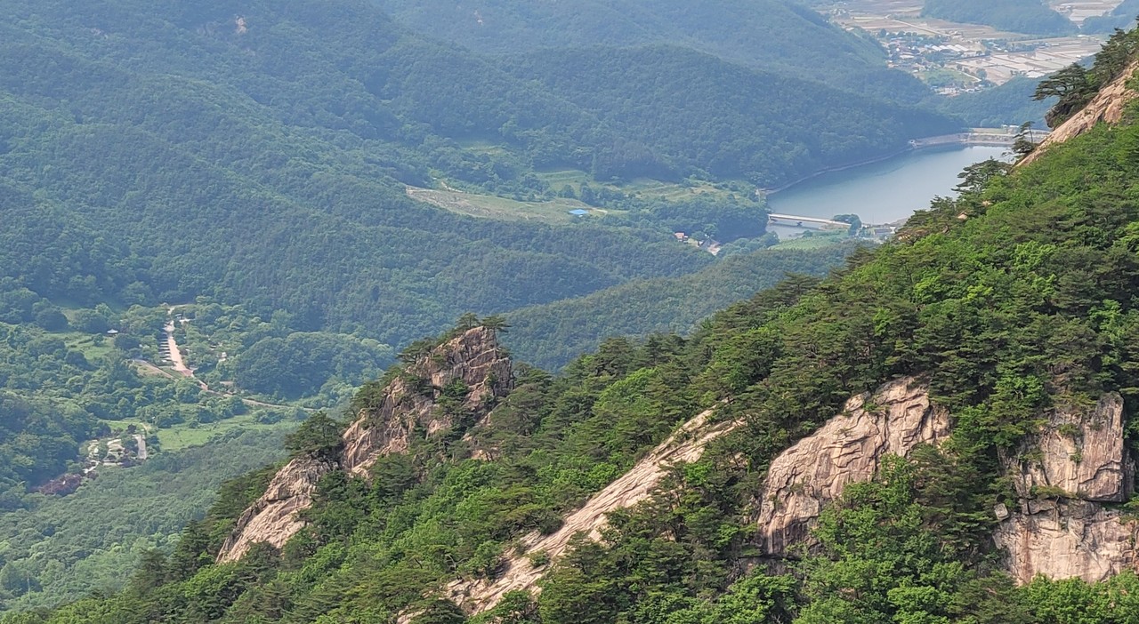 내리막길이 호락호락하진 않다. 금세 내려갈 것 같은데 그렇지도 않다. 그만큼 뷰 파노라마도 끝나지 않았다. 낙조대에서 10여 분, 바위 사잇길을 통과하면 웅장한 포스의 바위가 맞이한다. 절로 감탄사 나오는 바위. 앞뒤에서 보며 감탄한다. 한참 내려온 거 같은데 이정표는 낙조대 500m 왔다고 말해준다. 수락주차장 ←2.3㎞를 가리킨다. 내려올수록 수락저수지와 수락마을이 크게 보인다. 토닥토닥 위로하는 것 같다. 중간중간 계단 조망쉼터에 서서 내려다본다. 길게 호흡한다.