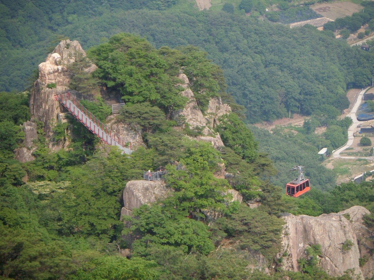 20분 남짓 올랐을까. 반가운 이정표가 보인다. ‘해발 860m, 정상까지 250m 남았습니다.’ 곧 마천대와 대둔산 남쪽 풍경이 장엄하게 열린다. 마천대로 가기 전 능선에 서서 남쪽 뷰를 즐감한다. 케이블카와 삼선계단, 금강구름다리가 눈에 들어온다. 케이블카가 오고가고, 금강구름다리에서 사진을 찍고 있는 관광객들이 조그맣게 보인다. 삼선계단을 오르는 사람들도 보인다.