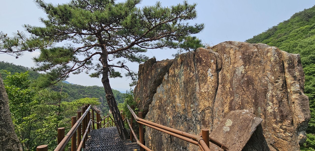 구름다리의 협곡 바람을 만끽한 후 조망쉼터로 향한다. 조망쉼터는 군지구름다리와 멀지 않다. 계단이 끝나는 지점 가까이에 바위로 감춰진 공간이 있다. 수락계곡에 올 때면 항상 여기서 쉬었다 간다. 너럭바위에 앉아 바라보면 첩첩이 산들과 하늘이 아이맥스 영화관이다. 마천대 쪽 봉우리 위의 하늘과 구름도 작품이다. 그 앞의 기묘한 나무 한 그루, 시원한 바람을 불러 모은다.