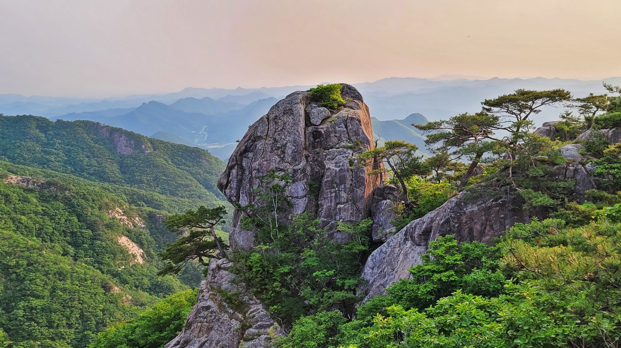 ③번과 ④번 사이에서 갈등한다. 한 번도 못 가본 ‘생애대’ 풍광 좋다는데 들렀다가 배티재로 내려갈까, 하다가 뉘엿뉘엿 넘어가는 해를 보고 낙조대로 향한다. 석양이 다가오긴 하는데, 뿌연 미세먼지가 방해한다. 아쉽다. 그래도 낙조대 가는 길은 눈이 호강한다. 이번엔 동쪽 뷰다. 기암괴석과 첩첩 산, 기묘하게 생긴 소나무가 눈길을 끈다. 마천대에서 30여 분, 낙조대 다 왔다는 이정표가 나온다. 859m 낙조대다.