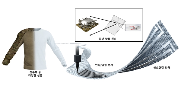 KAIST 신소재공학과 스티브 박 교수 연구팀은 섬유 위에 전자회로를 그려 넣는 혁신적인 기술을 통해 유연하고 착용 가능한 전자 섬유(E-textile) 플랫폼을 개발했다고 25일 밝혔다. 연구진은 3D 프린팅 기술과 신소재공학적 설계를 결합해 유연하면서도 내구성이 뛰어난 센서와 전극을 섬유에 직접 인쇄했다. 이를 통해 전투원 개개인의 정밀한 움직임과 인체 반응 데이터를 수집하고 이를 기반으로 맞춤형 훈련 모델을 제시할 수 있도록 했다.