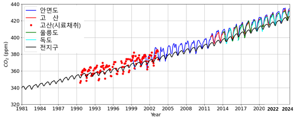 기상청이 30일 내놓은 ‘2024 지구대기감시보고서’에 따르면 지난해 우리나라 이산화탄소 배경농도는 안면도(충남 태안)에서 430.7㏙, 고산과 울릉도에서 각 429.0㏙, 428.0㏙을 기록하며 3개 지점 모두 최고치를 경신했고 특히, 안면도의 경우 전년 대비 3.1㏙ 증가해 최근 10년(2015~2024년) 새 2016년(3.7㏙ 증가)에 이어 두 번째로 큰 연간 증가폭을 기록했다. 고산과 울릉도는 전년 대비 각 2.9㏙, 2.4㏙ 증가했다. 앞서 미국해양대기청이 지난 4월 발표한 2024년 전지구 평균 이산화탄소 배경농도는 422.8㏙으로 전년 대비 3.4㏙ 상승해 최근 10년 새 가장 큰 연간 증가폭을 기록했다.