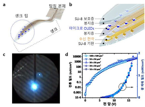 연구팀은 채널로돕신2의 활성화에 적합한 470㎚(나노미터) 파장에서 ㎟당 1㎽(밀리와트) 이상의 광 파워 밀도를 갖는, 즉 광유전학 및 생체조직 자극 응용에서 상당히 높은 수준의 광출력을 가진 마이크로 OLED 집적 유연 뉴럴 프로브를 개발했다. 또 초박막 유연 봉지막(소자를 외부 환경요인인 산소와 물 분자로부터 완전히 차단하는 막 기술)은 낮은 수분 투습률을 보이며 소자 수명을 10년 이상 유지할 수 있게 한다. 또 패릴렌-C(parylene-C)를 기반으로 생체 내 높은 봉지막 성능을 발휘하며 전기적 간섭과 휨 이슈 없이 집적된 OLED의 개별 구동을 성공적으로 시연했다.