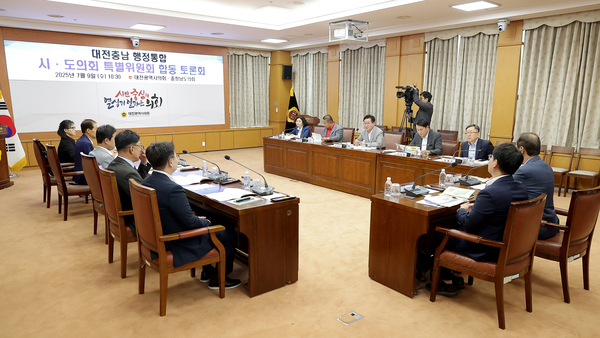 대전시의회와 충남도의회 행정통합 특위 위원들이 한 자리에 모여 대전-충남 행정통합 추진상황을 공유하고 향후 추진 방향을 논의했다.