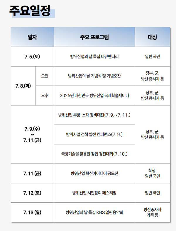 또 11일에는 서울 전쟁기념관에서는 초등학생부터 대학생, 일반 시민까지 전 세대가 참여할 수 있는 ‘방위산업 혁신아이디어 공모전’ 본선 및 시상식도 열릴 예정이다.