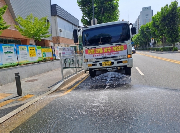 구는 지난 9일부터 도심 열섬현상 완화를 위해 살수차 2대를 가동하고 있다. 특히 무더위가 집중되는 오후 1시부터 5시까지 주요 도로에 집중 살수작업을 실시 중이다.