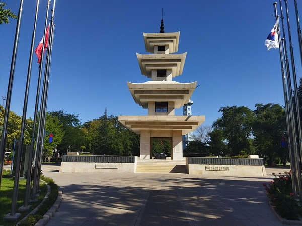 공원에서 가장 큰 비중을 차지하고 있는 ‘한국전 참전 기념탑’은 경주 불국사의 석가탑을 이미지화했다고 하지만, 어린이 장난감인 레고나 블록쌓기처럼 밋밋하고 투박해서 값싼 조형물 느낌이다. 기념탑의 기단부에는 희생자들을 기리는 제단이 있는데, 제단에는 한국의 유엔군 묘지에 묻힌 흙을 일부 채취하여 이곳에 옮겼다는 내용을 한글과 튀르키예어로 나란히 소개하고 있다. 기념탑으로 올라가는 계단 벽면에는 한국전에서 희생된 773명의 튀르키예 병사들의 이름과 계급, 출생 연도, 사망 일자 등을 빼꼼하게 새겨 두었다.