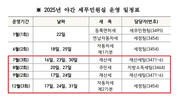 시 관계자는 “세금 관련 문의가 있으나 생업 등으로 주간에 민원실 방문이 어려운 분들께서는 야간 세무민원실을 적극 활용해 주시길 바라며 오는 7월 31일 재산세 납부 기한 내에 성실히 납부해 주시길 당부드린다”고 말했다.