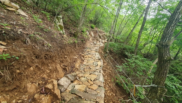 군은 등산객들의 안전사고 예방과 자연 친화적 숲길 조성을 위해 이번 사업에 들어가 노면을 고르게 정비하고 등산로 방향안내판, 안전로프난간, 돌계단 설치 등 안전한 산행환경을 보강했다.