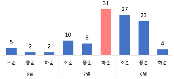21일 행정안전부에 따르면 최근 5년간(2020~2024년) 물놀이 사고로 인한 사망자는 모두 112명으로 여름방학과 휴가가 시작되는 7월 하순에 사망사고 발생이 급증해 8월 중순까지 이어진다. 이 기간 물놀이 사망자는 7월 하순 31명, 8월 초순 27명, 8월 중순 23명으로 72%가 이 기간에 집중돼 있다. 장소별로는 하천(강)이 39명(35%)으로 가장 많고 계곡 33명(30%), 해수욕장 25명(22%), 바닷가(갯벌·해변) 15명(13%) 순이다.