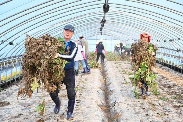 김제선 대전 중구청장(왼쪽)이 최근 충남 부여의 수해 현장을 찾아 복구 봉사활동을 통해 쓰레기를 치우고 있다. 김 청장과 함께 공무원, 자원봉사센터 관계자 등 40여 명도 구슬땀을 흘렸으며 이들은 농가에 음료와 간식 등 150만 원 상당의 구호 물품을 전달했다. 김 청장은 “피해 농가 주민 여러분이 하루빨리 평온한 일상으로 복귀할 수 있기를 바란다”라고 위로했다.