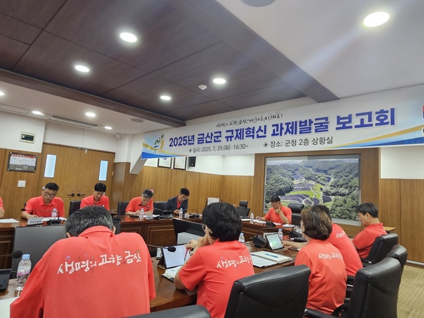 금산군은 지난 29일 군청 상황실에서 규제혁신 과제발굴 보고회를 개최하고 부서별 규제개선 과제에 대해 보고 및 논의하는 시간을 가졌다.