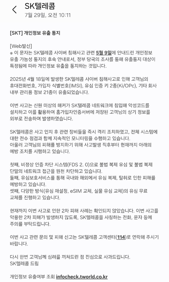SKT는 민관합동조사를 통해 유출통보 대상이 특정됨에 따라 28일부터 피해 이용자를 대상으로 통지 문자를 발송 중이다. 여기엔 “2025년 4월 18일에 발생한 SK텔레콤 사이버 침해사고로 인해 고객님의 휴대전화번호, 가입자 식별번호(IMSI), 유심 인증 키 2종(Ki/OPc), 기타 회사 내부 관리용 정보 21종이 유출되었습니다”와 같은 안내가 담겼다. 세대주인 문 모(47·대전 동구) 씨는 “가족 4명 전원에게 유출통지 문자가 발송됐다. 지인들도 받지 않은 사람이 더 적은 것 같다”며 “황당하고 화가 치밀어 오른다. 어떻게 대기업의 해킹 대비가 이렇게 허술한가”라고 꼬집었다.