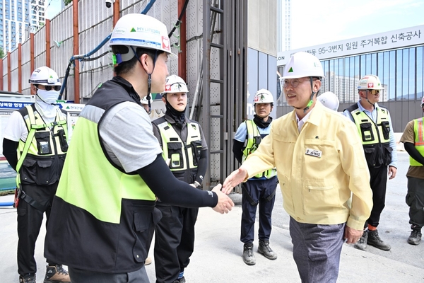 김제선 대전 중구청장(오른쪽)이 31일 선화동 일대 주택건설공사장을 찾아 폭염 대비 온열질환 예방을 위한 현장 점검을 실시하며 관계자를 격려하고 있다. 김 청장은 “무더위 속에서 폭염에 노출되는 옥외작업자의 안전사고 예방을 위해 최선을 다하겠다”라고 말했다.
