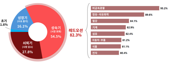 대한상공회의소가 지난 6월 2일부터 13일까지 전국 제조업체 2186곳을 대상으로 ‘신사업 추진현황 및 애로사항’을 조사한 결과 응답기업의 82.3%가 현재 주력제품 시장이 레드오션에 접어들었다고 평가했다. 54.5%는 시장 포화상태인 ‘성숙기’, 27.8%는 시장 감소상황인 ‘쇠퇴기’라고 답했으며 수요가 증가하는 ‘성장기’라고 답한 기업은 16.1%에 그쳤다. 시장 형성 초기인 ‘도입기’란 응답은 1.6%였다. ‘성숙·쇠퇴기’ 응답 기업의 업종별 분포를 보면 비금속광물(95.2%), 정유·석유화학(89.6%), 철강(84.1%), 기계(82.9%), 섬유(82.4%), 자동차·부품(81.2%) 등의 순이다.