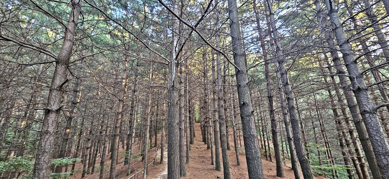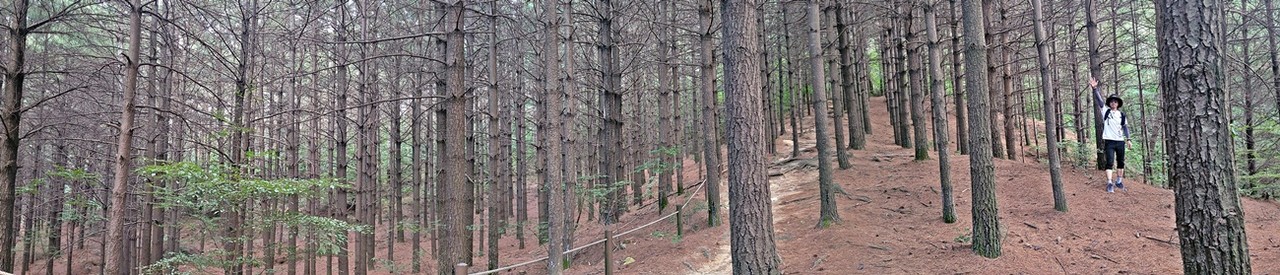 수통골 주차장 옆에 근사한 건물이 하나 있다. 이란성 쌍둥이 건물인데 왼쪽은 카페고 한곳은 봉이호떡집이다. 그 사이를 통과하면 빈계산 오르는 들머리가 나온다. 길을 따라 오르면 감탄사를 부르는 소나무숲을 만난다. 촘촘하게 규칙적인 오와 열로 서있는 소나무들. 이 숲을 따라 이어진 길을 밟으면 명품숲을 만난다.