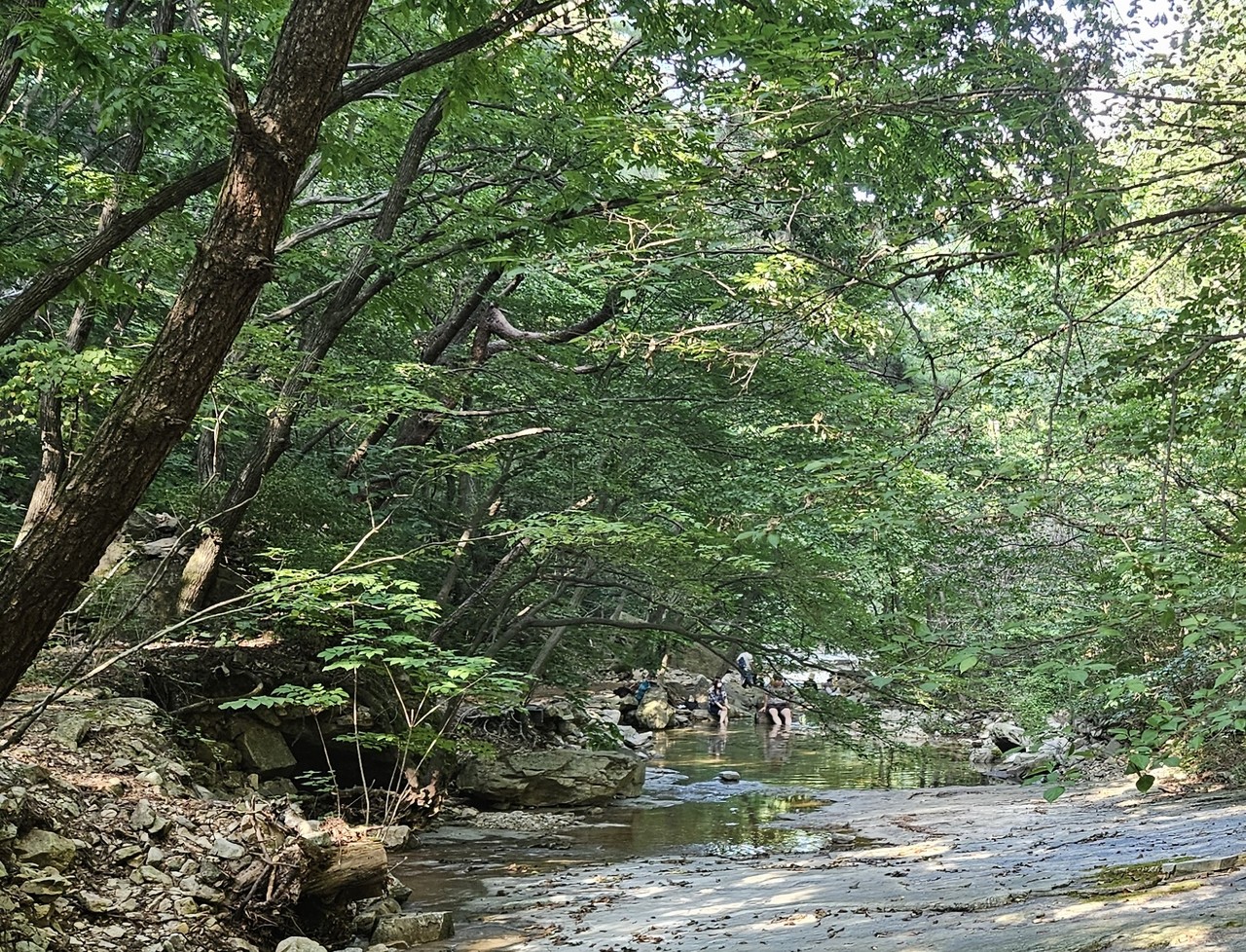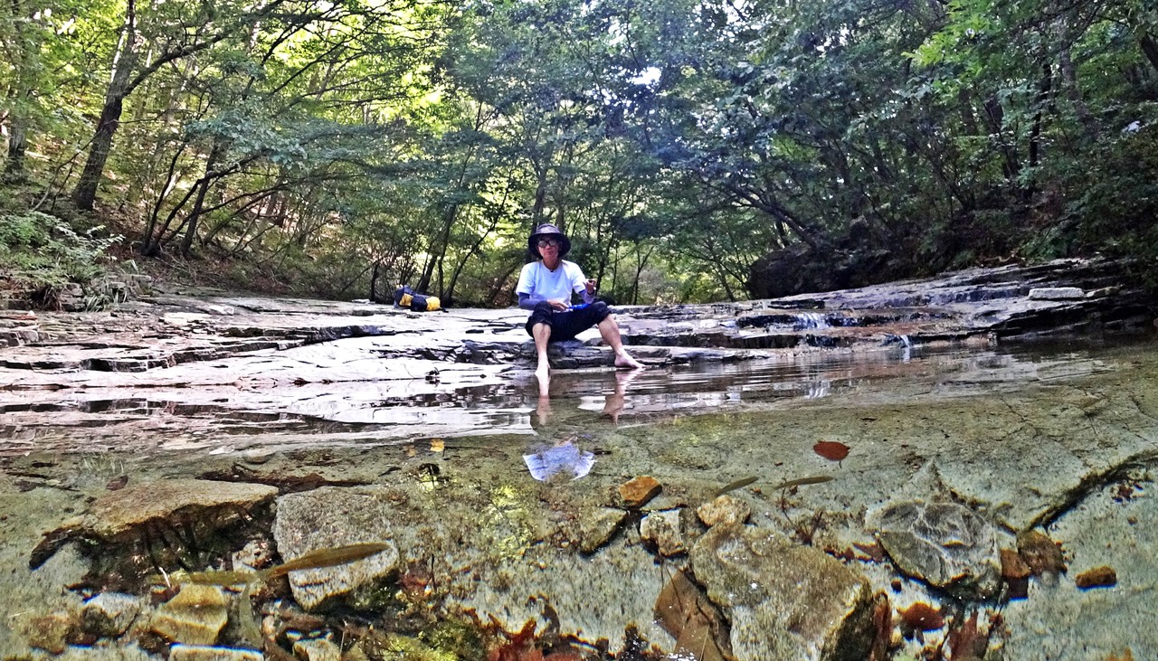 널따란 바위가 있고 그 옆에 계곡물이 흐르는 ‘명당’에 자리를 잡았다. 발을 담근다. 시원하다. 더위를 내쫓는다. 천천히 부채질하며 탁족(濯足). 청정 자연의소리와 바람에 마음이 고요해진다. 바위에 누워 나무 사이 하늘을 본다. 눈을 감고 한참을 멍하게 있는다. 몸의 피로도 마음의 상처도 씻겨간다.