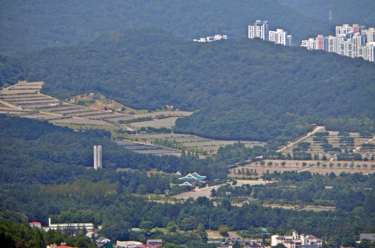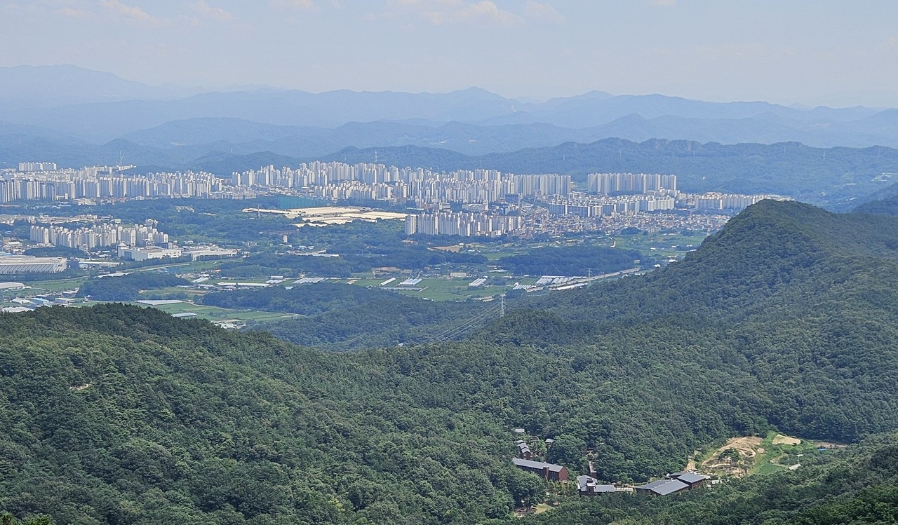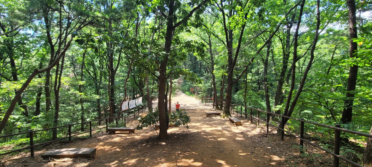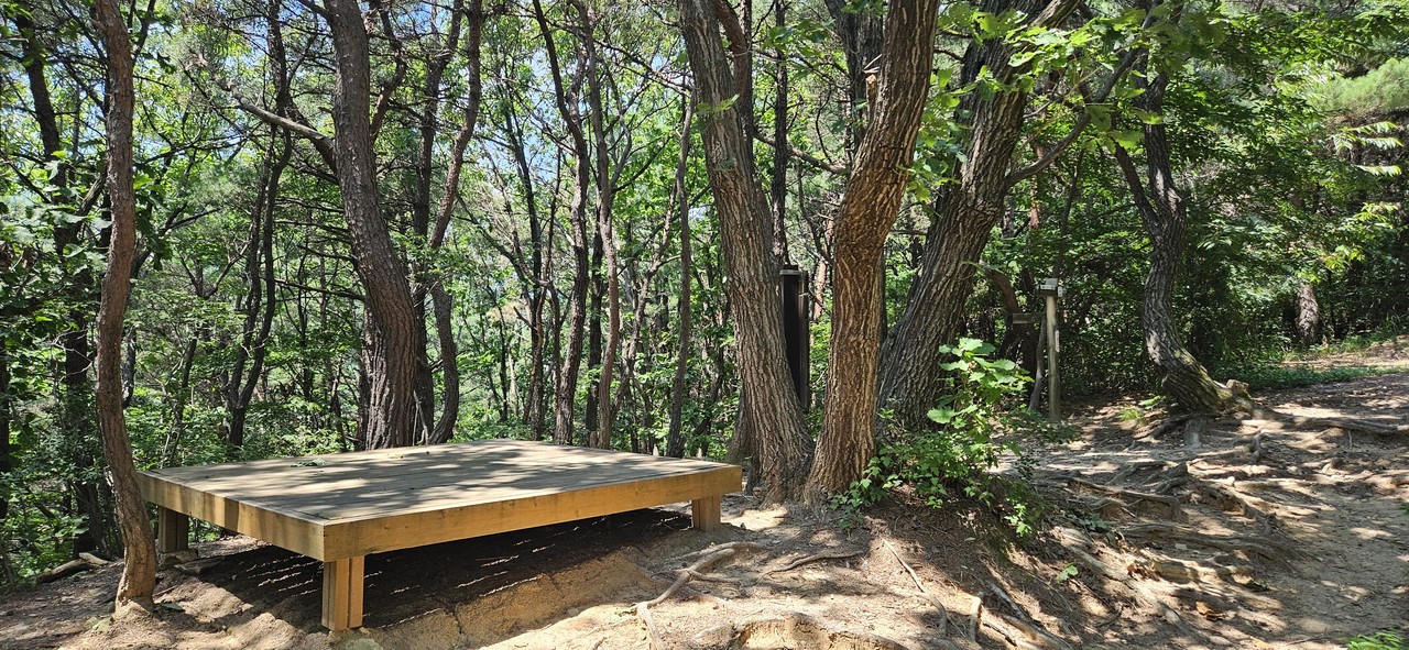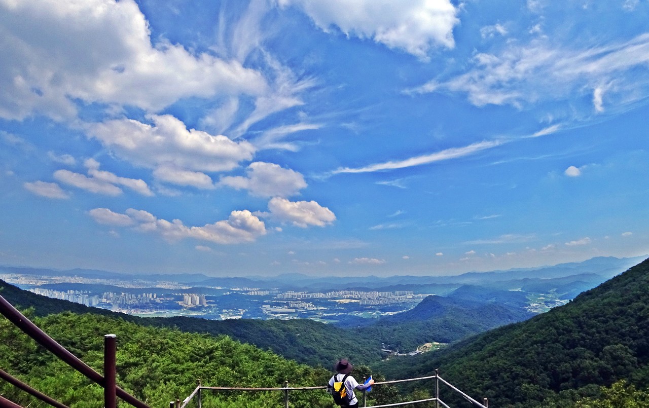 오르막 30여 분, 드디어 조망이 열리기 시작했다. 오른쪽으로 도덕봉과 옥녀봉이 보이고 그 옆으로 국립대전현충원이 눈에 들어온다. 사진 찍는 핑계로 또 한 걸음 쉬어간다. 저 앞에 보이는 금수봉 정상은 아직 멀었다. 쉬기로 한 조망쉼터다. 한참 쉬었다 가야지.