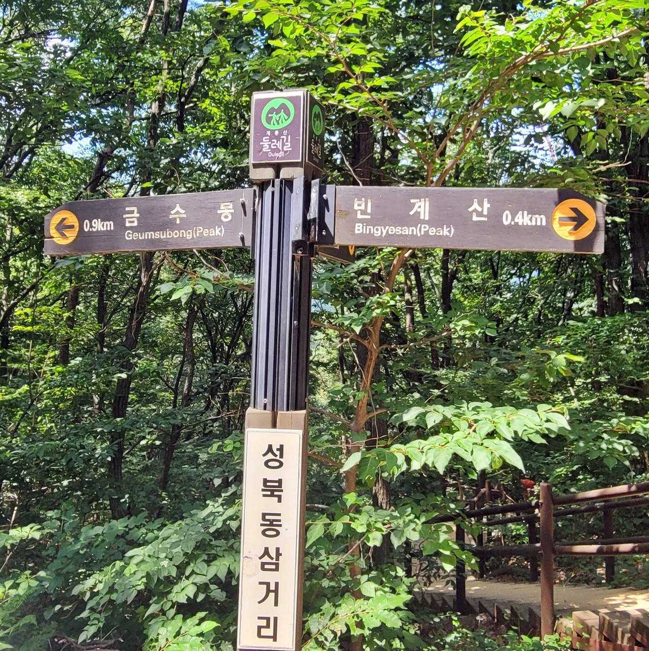 빈계산 정상은 조망이 없다. 서성이다가 성북동삼거리(0.4㎞)/금수봉(1.3㎞) 방향으로 튼다. 내리막이다. 너무 내려간다. 계속 내려가면 불안하다. 가야할 금수봉은 해발 530m. 아, 어쩌란 말인가. 계속 내려간다. 나무계단, 돌계단. 10여 분 내려가니 성북동삼거리다. 한참을 내려 왔으니 이제 가파르게 치고 오를 일만 남았다. 옆에 있는 이정표를 괜히 바라본다. ‘수통폭포삼거리 1.1㎞→.’