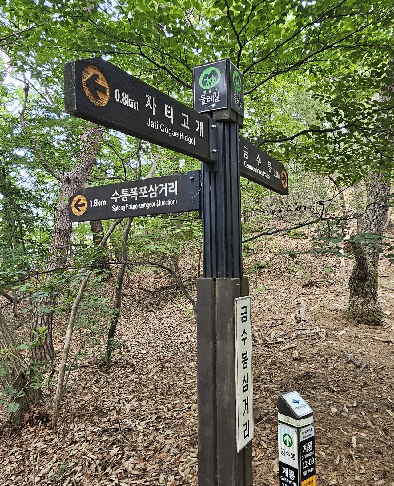금수봉에서 0.6㎞ 걸어 금수봉삼거리다. 긴 내리막의 시작점이다. 자티고개/도덕봉 방향으로 진행치 않고 방향을 틀어 내려가는 건 처음이다. 금수봉삼거리~수통폭포삼거리 구간은 올라온 적도 내려온 적도 없다.