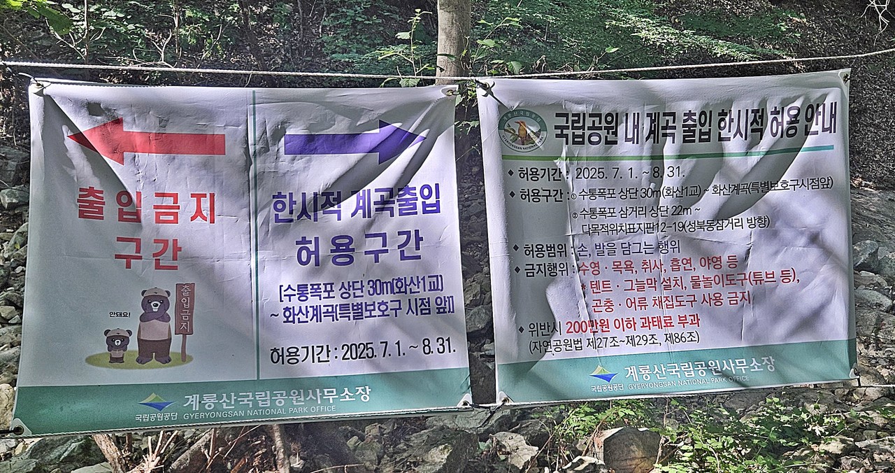그래도 계곡에 앉아 발 담그고 이야기 나누는 시민들이 꽤 있다. 계룡산국립공원사무소는 한시적으로 화산계곡 일부 구간 출입을 허용하고 있다. 7월과 8월 두 달간 허용한다. 수통폭포 상단 30m 지점부터 화산계곡 특별보호구역 앞까지 등이다. 덕분에 시민들이 이곳 화산계곡 위쪽까지 올 수 있다.