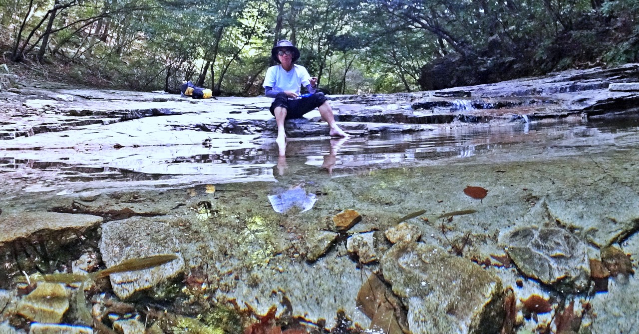 사진 하나 건지려고 애쓴다. 물가에 삼각대 세워놓고 바위 위에 앉아 포즈를 취해본다. 늘 어색한 포즈지만 안 어색한 척 해본다. 물속에 물고기들이 왔다갔다 한다. 물고기와 같이 사진에 담아볼까, 애쓴다. 물고기가 오는 타이밍 맞춰 폰카 리모컨을 누른다. 허허, 낚시하는 기분이다. 한참을 눌러본다. 그나마 건진 찰나가 아래 사진. 물고기 찾으셨나요?